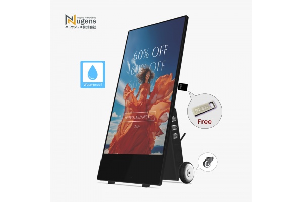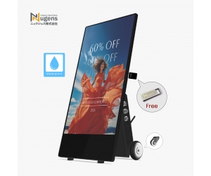 自由移動: 配備可移動輪架與內建充電電池(行動版),無需複雜電源配置,廣告位置隨心調整。