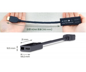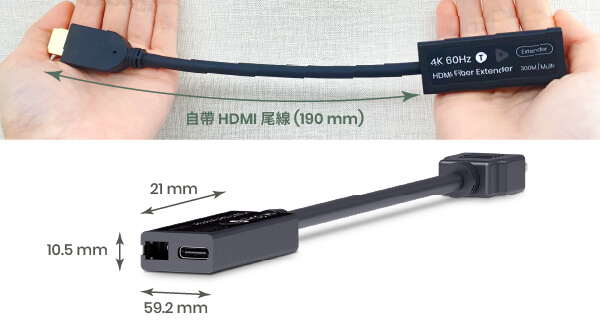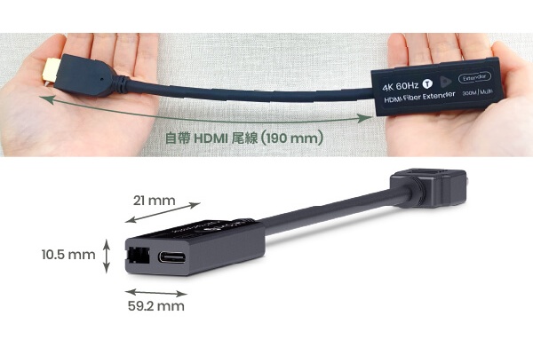 The extender measures just 62.2 × 25 × 12 mm and features a 190 mm HDMI pigtail for flexible installation.
