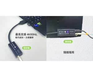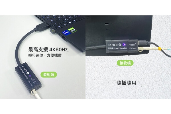The HE01FE-4K6G transmitter draws 5V power from the source HDMI port, so only the receiver requires a USB-C power source, making installation more convenient.