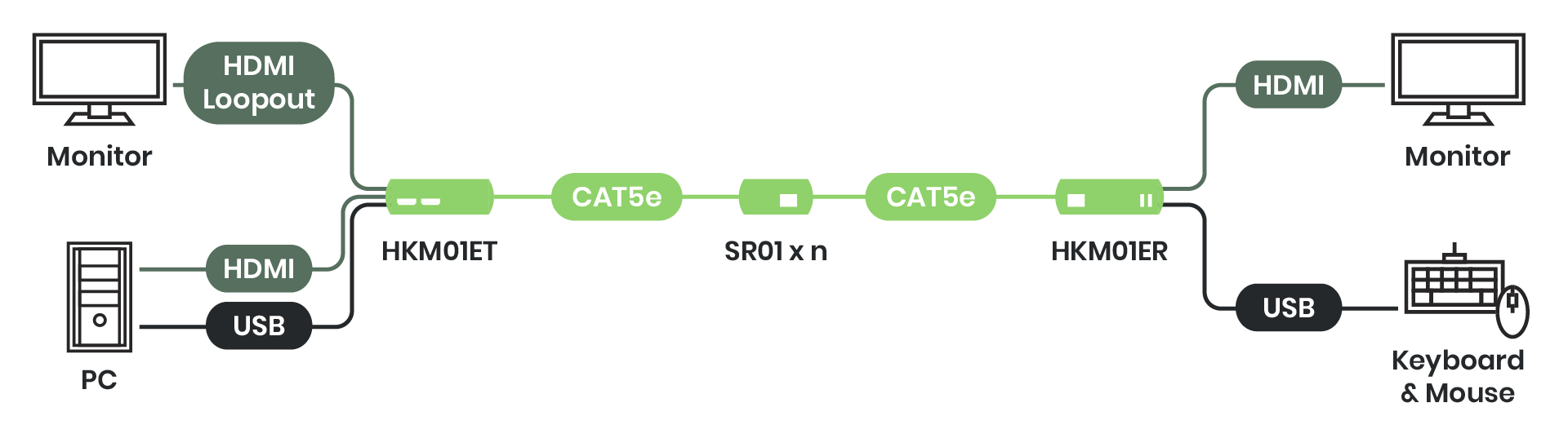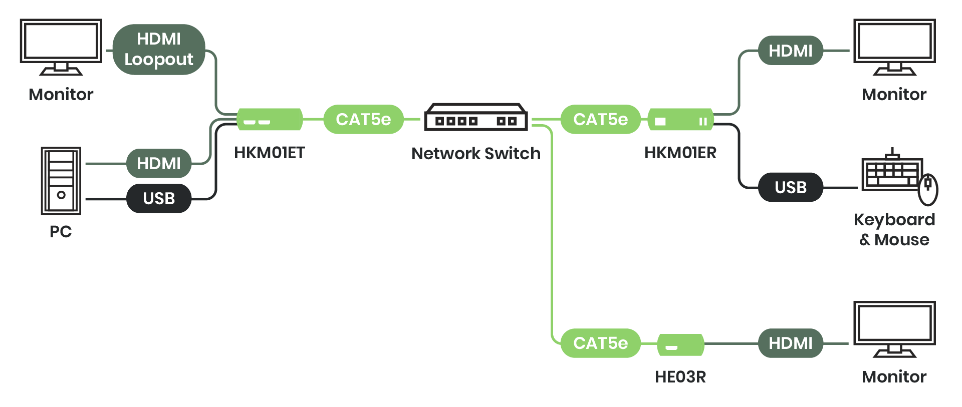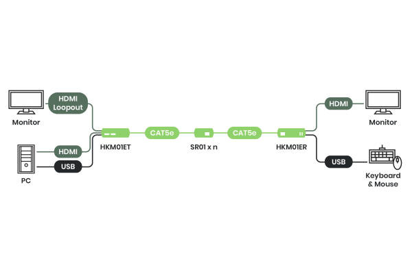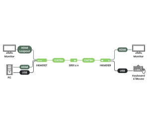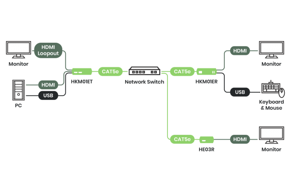 HKM01E is an HDMI® KVM extender that sends HDMI® & USB signal over one CAT5e or greater cable. Its TX unit has a local loop out for an extra HDMI® monitor. And there are 2 built-in USB ports at the RX unit to connect with one keyboard and one mouse. It is an ideal solution for CCTV, digital signage, home network integration, and so on.