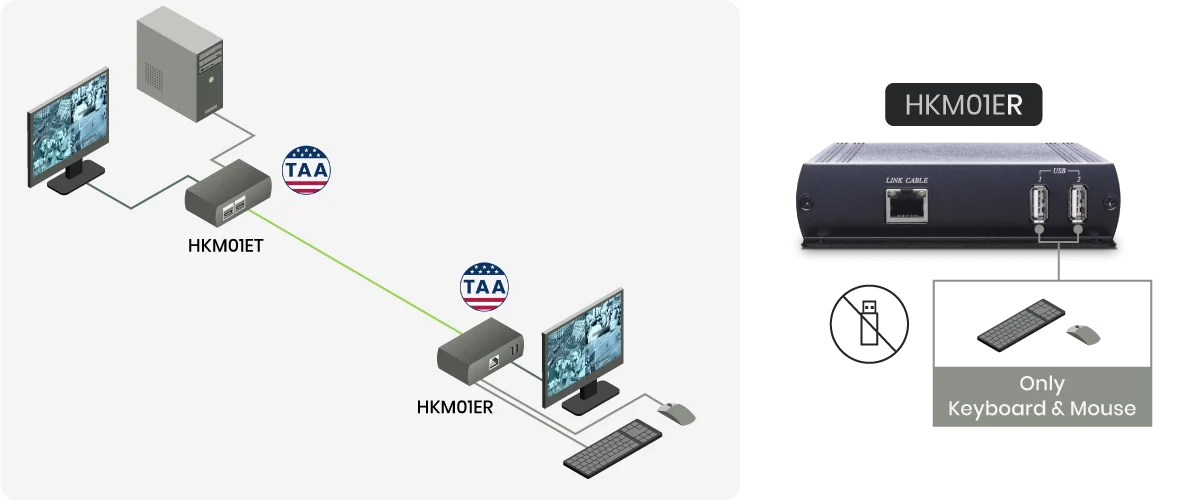 If your KVM extender only needs to handle keyboard and mouse control, the HKM01E is one of the most cost-effective and practical choices available. Designed with essential functionality in mind—video, keyboard, and mouse—it delivers excellent value while complying with TAA standards.