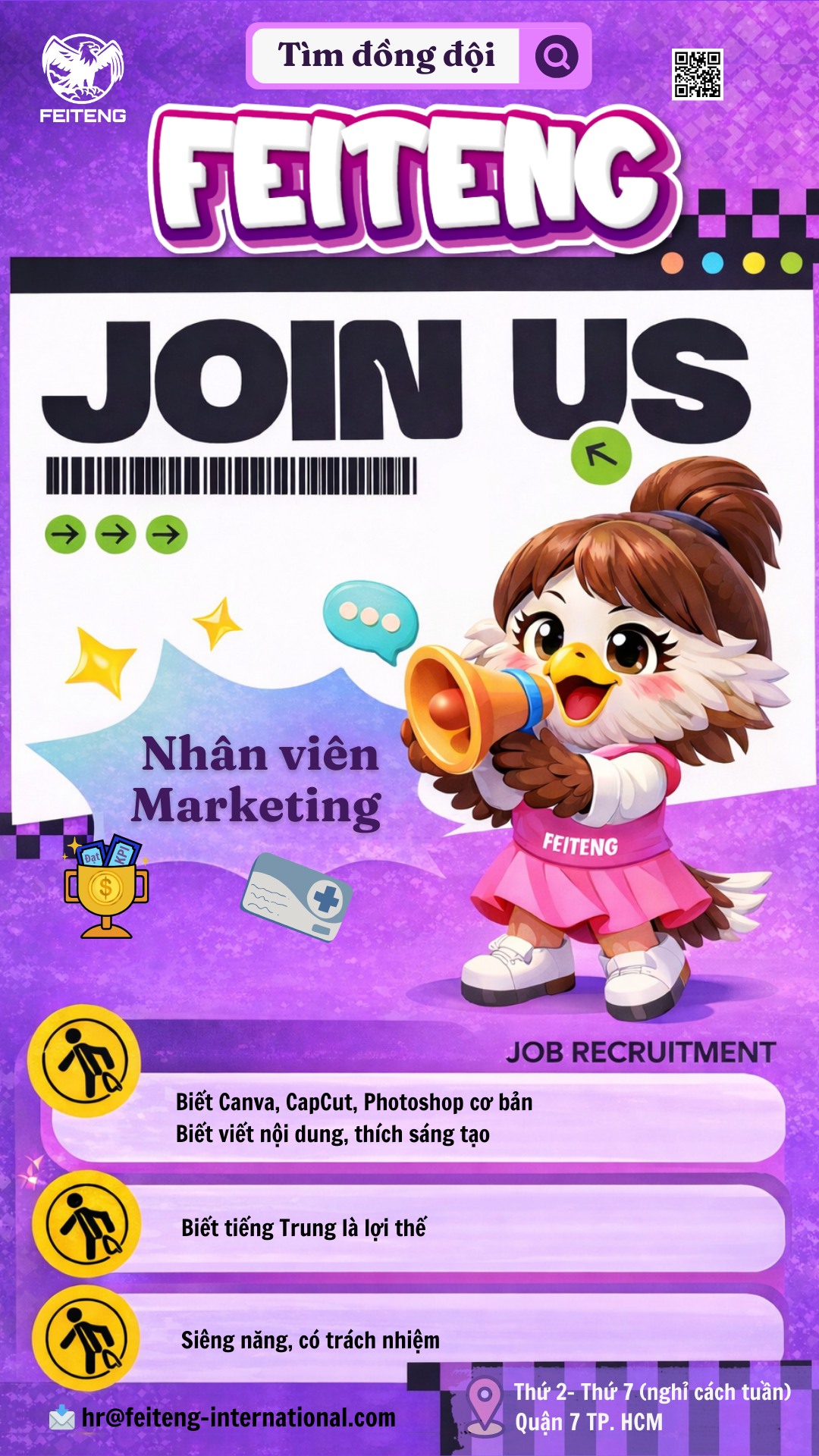 Please inbox us or send your CV and portfolio (if any) to: hr@feiteng-international.com