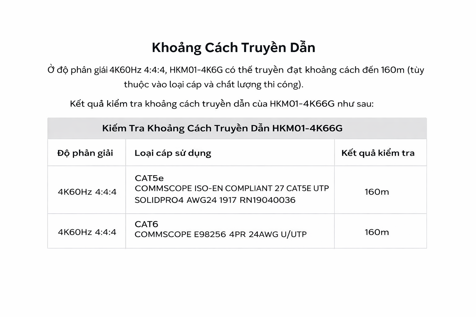 Qua quá trình kiểm tra nghiêm ngặt, HKM01-4K6G có thể truyền xa đến 160m qua cáp Cat5e và lên đến 20km khi sử dụng module cáp quang, đáp ứng đa dạng nhu cầu truyền dẫn từ tầm trung đến khoảng cách xa.