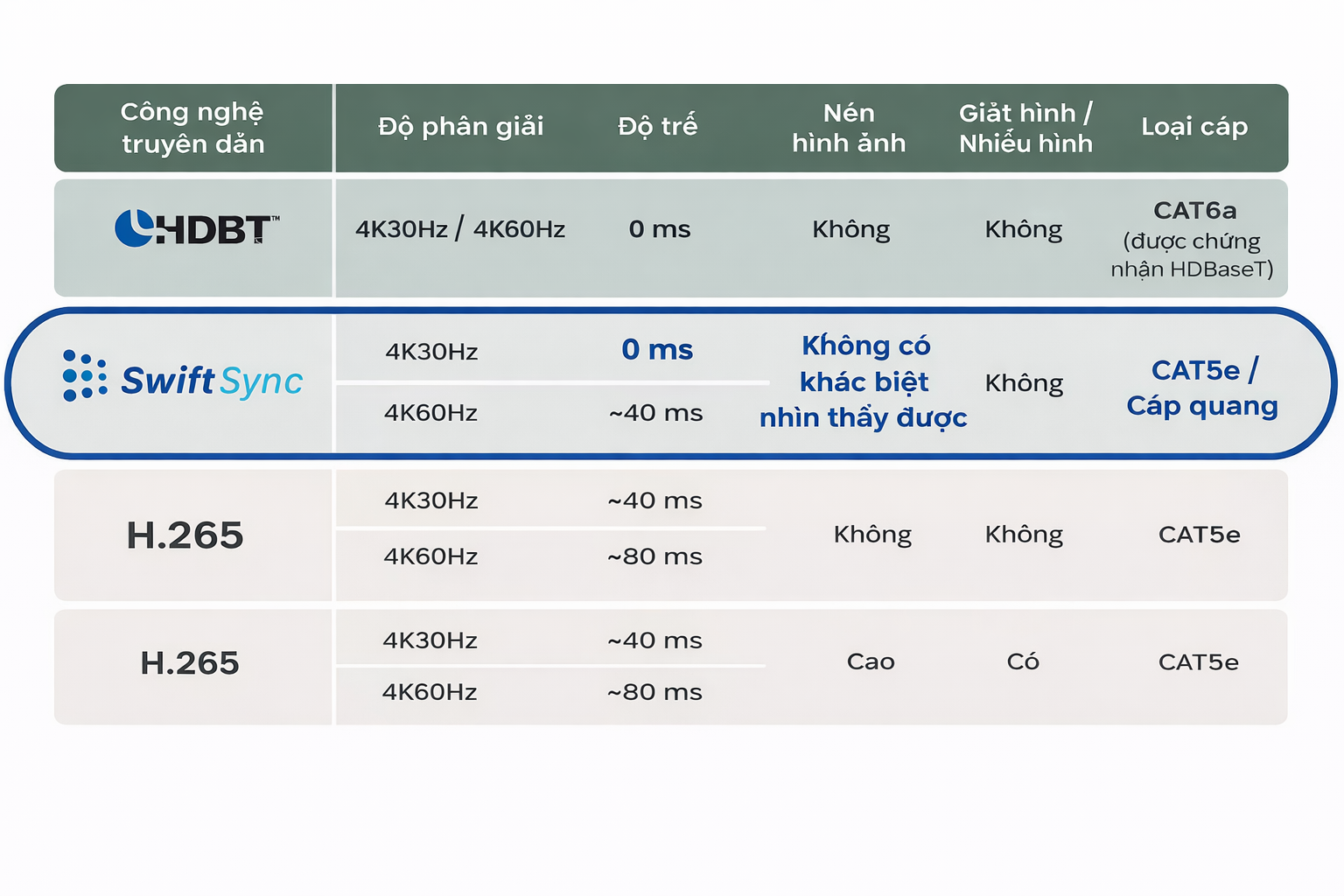 SwiftSync là công nghệ truyền dẫn HDMI® hiệu suất cao, cung cấp giải pháp tiết kiệm chi phí so với HDBaseT không nén. Với công nghệ nén 1G tiên tiến, SwiftSync hỗ trợ 4K@60Hz và giữ độ trễ dưới 2 khung hình (0,03 giây) — gần như thời gian thực, không có độ trễ có thể nhận thấy. Hãy xem video thử nghiệm của chúng tôi để trực tiếp đánh giá độ trễ và chất lượng hình ảnh.