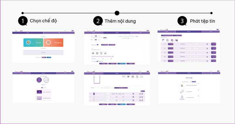 Sau khi đăng nhập, bạn có thể thiết lập và cập nhật nội dung trình chiếu một cách dễ dàng chỉ với 3 bước. Nội dung có thể được cài đặt trực tiếp trên màn hình hoặc điều khiển từ xa thông qua laptop/máy tính.
