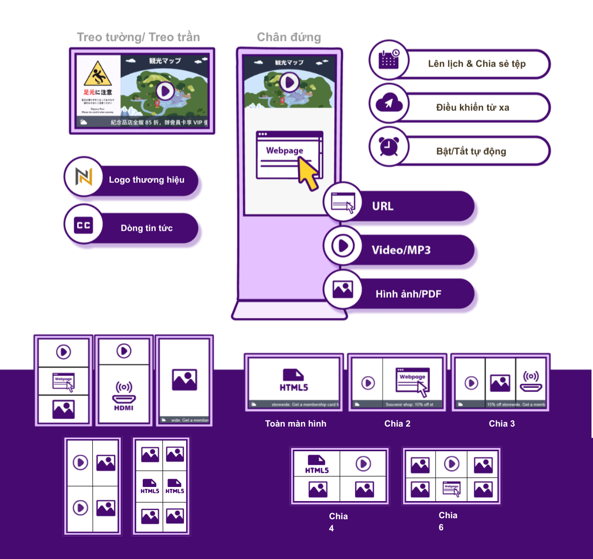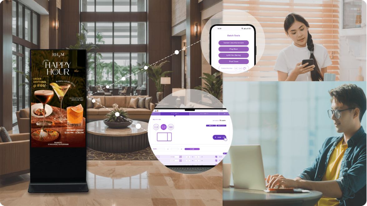 Với kích thước từ 15 inch đến 200 inch, hiển thị dọc hoặc ngang, LCD, LED, e-paper hay video wall — tất cả đều được quản lý tập trung trong một giải pháp chuyên nghiệp và tối ưu chi phí.