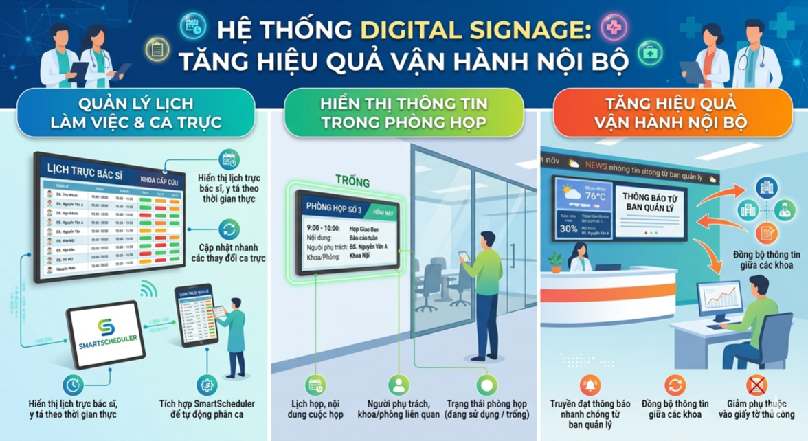 Không chỉ phục vụ bệnh nhân, hệ thống Digital Signage còn đóng vai trò quan trọng trong vận hành nội bộ: