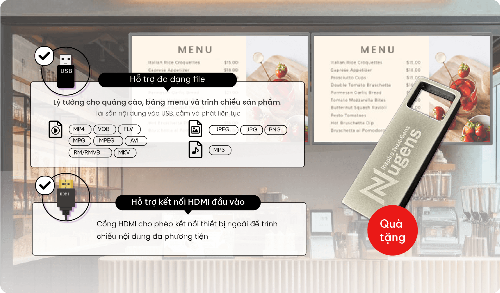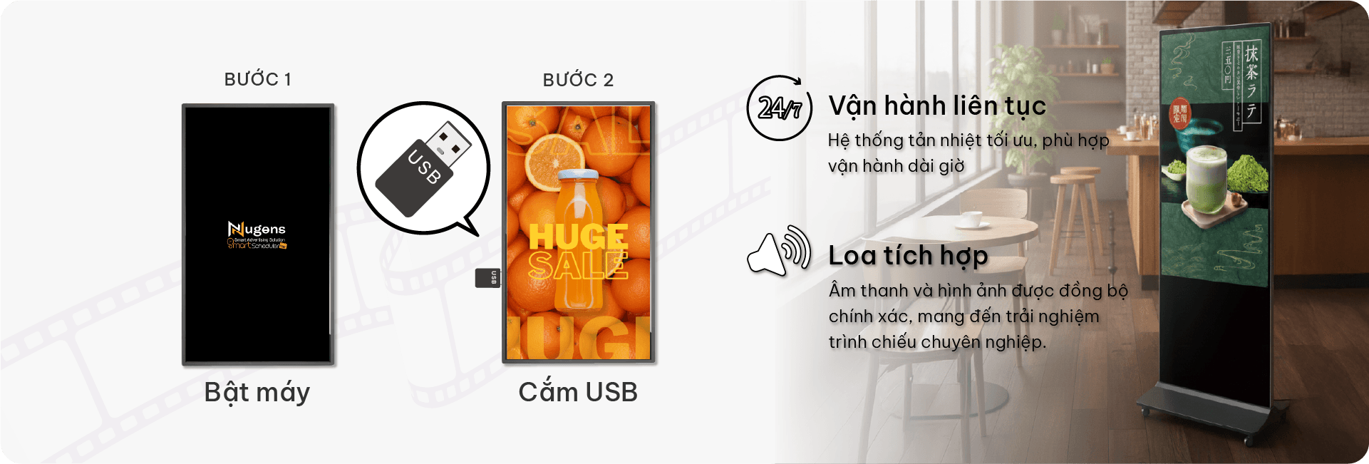 Vận hành dễ dàng - liên tục Chỉ cần cắm USB, hệ thống sẽ tự động chạy nội dung mà không cần cài đặt phức tạp.