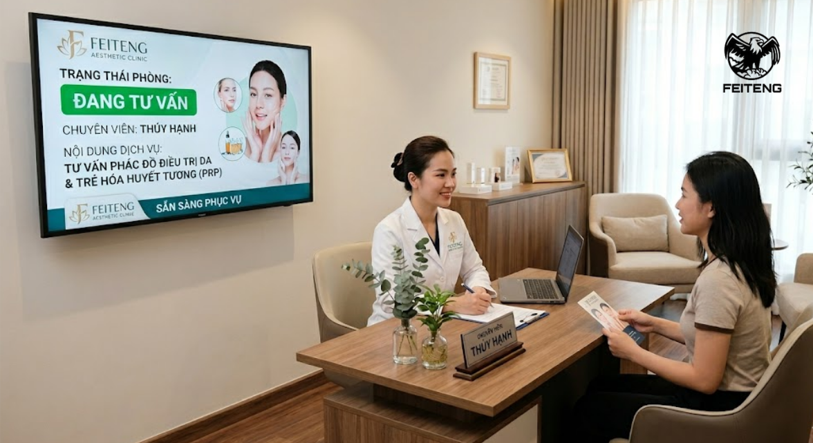 Màn hình phòng tư vấn giúp hiển thị tên chuyên viên, nội dung dịch vụ hoặc trạng thái phòng.