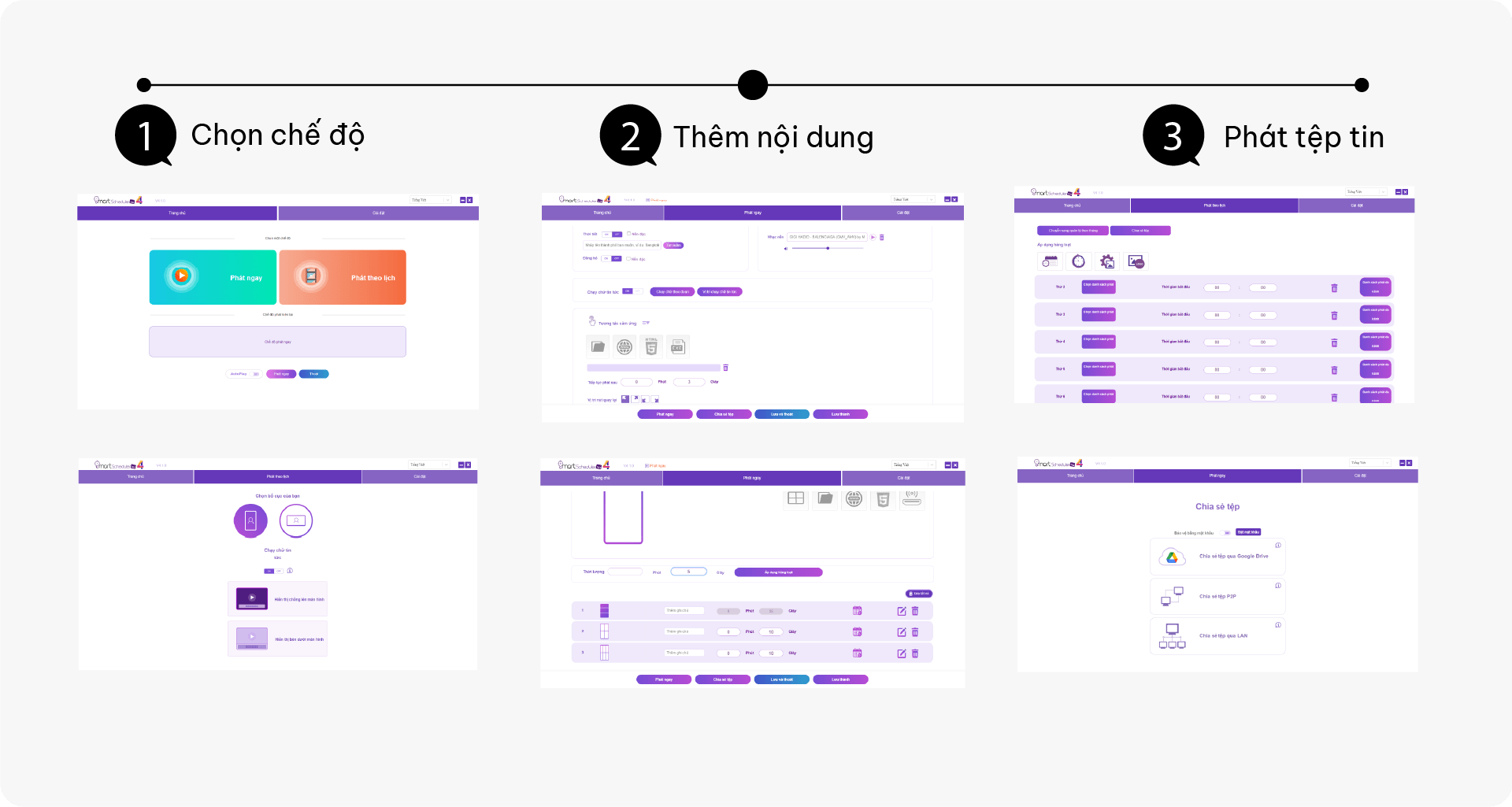 Màn hình quảng cáo Nugens sử dụng phần mềm SmartScheduler giúp doanh nghiệp quản lý và lập lịch phát nội dung dễ dàng. Phần mềm được thiết kế tối ưu để người dùng có thể vận hành dễ dàng chỉ với 3 bước cơ bản: nhập nội dung, thiết lập lịch trình và hoàn tất phát sóng. Quy trình đơn giản này giúp doanh nghiệp tiết kiệm thời gian triển khai, không cần đội ngũ kỹ thuật chuyên sâu mà vẫn có thể quản lý nội dung hiệu quả.
