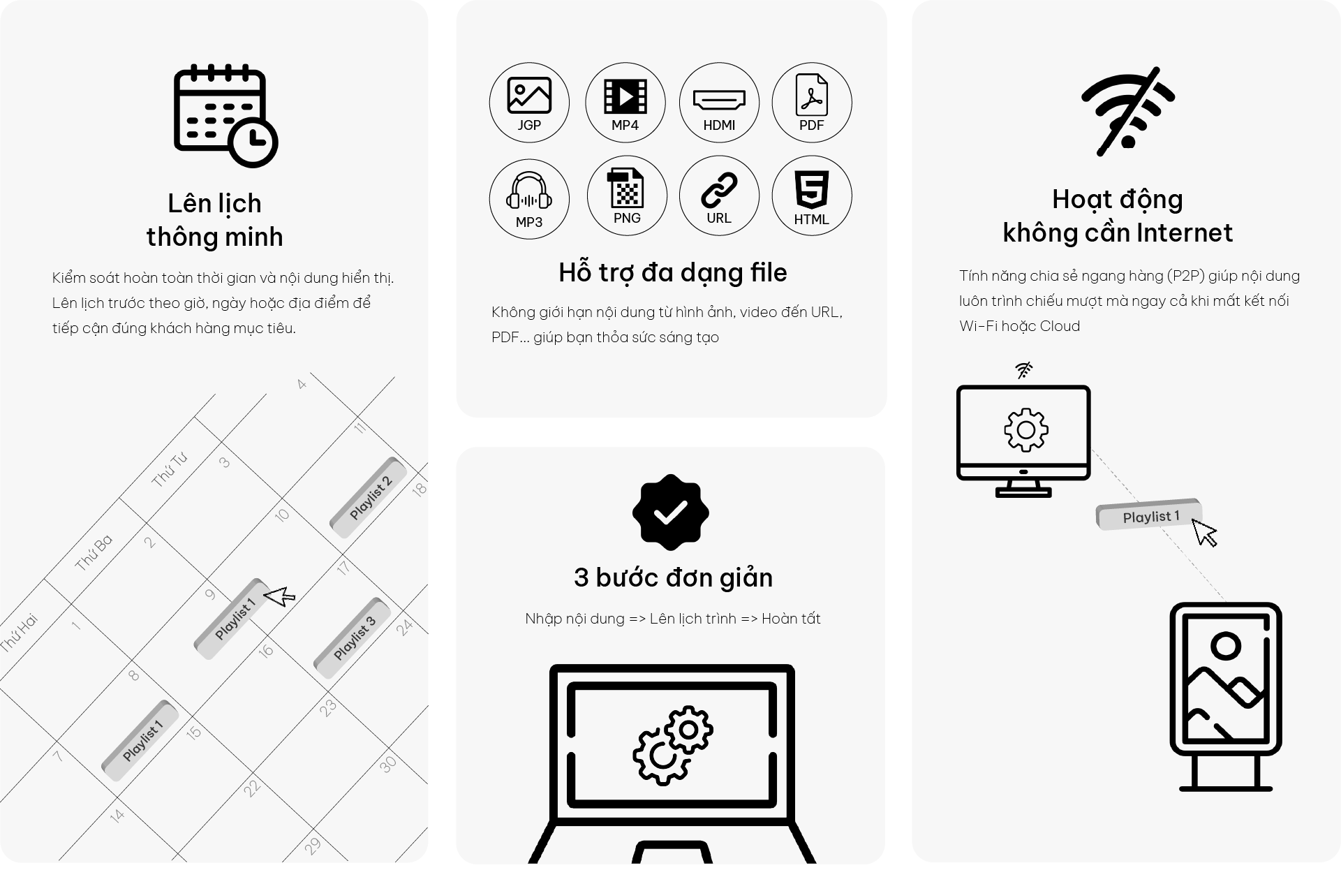 - Tiện ích: Phát nội dung offline qua USB (Plug & Play) mà không cần internet