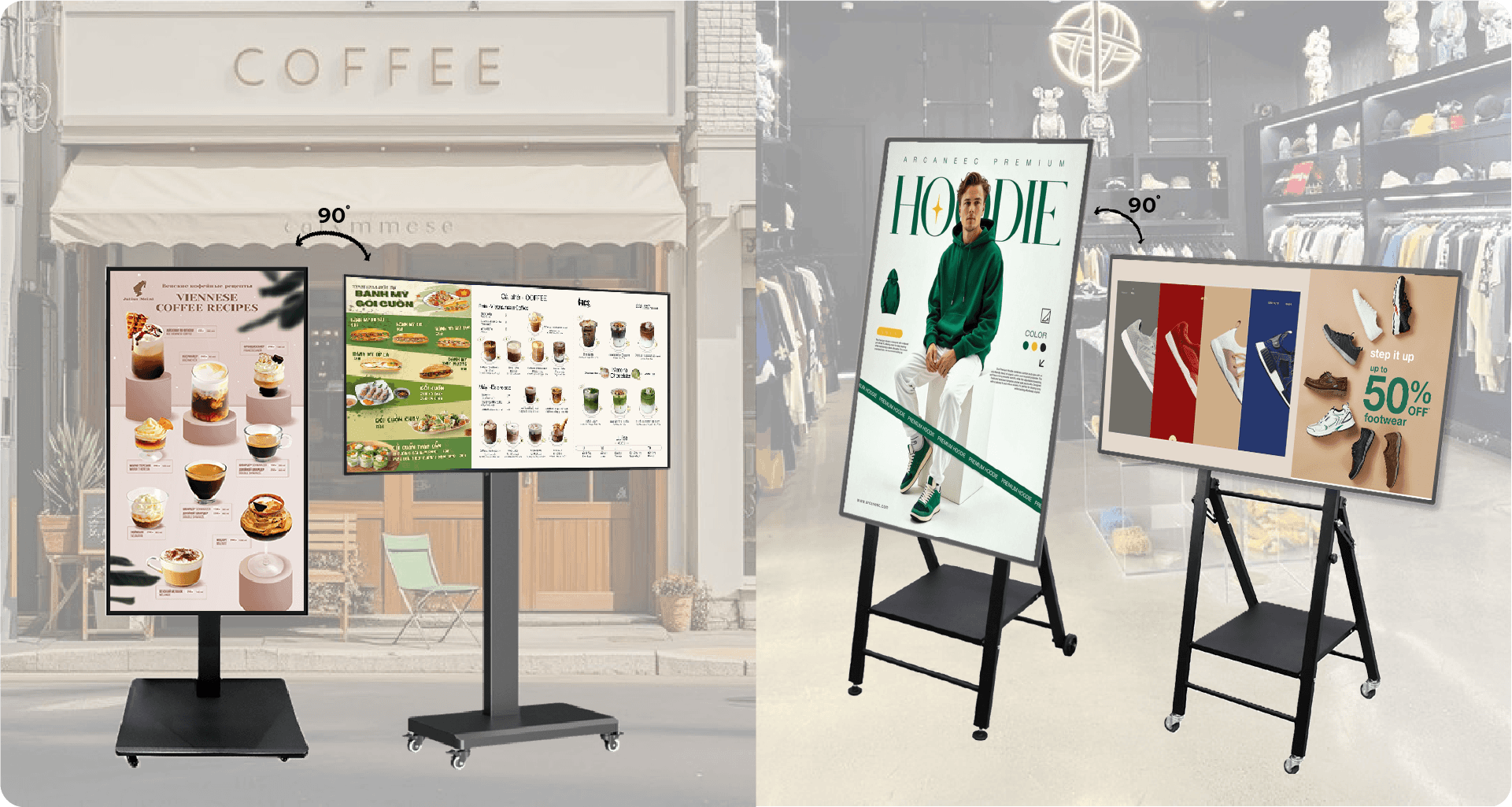 Sản phẩm hỗ trợ linh hoạt cả hai chế độ hiển thị ngang và dọc, phù hợp với nhiều không gian lắp đặt khác nhau như cửa hàng, trung tâm thương mại hay sảnh doanh nghiệp. Nội dung luôn được hiển thị sắc nét, không bị bóp méo, đảm bảo trải nghiệm hình ảnh tốt nhất cho khách hàng.