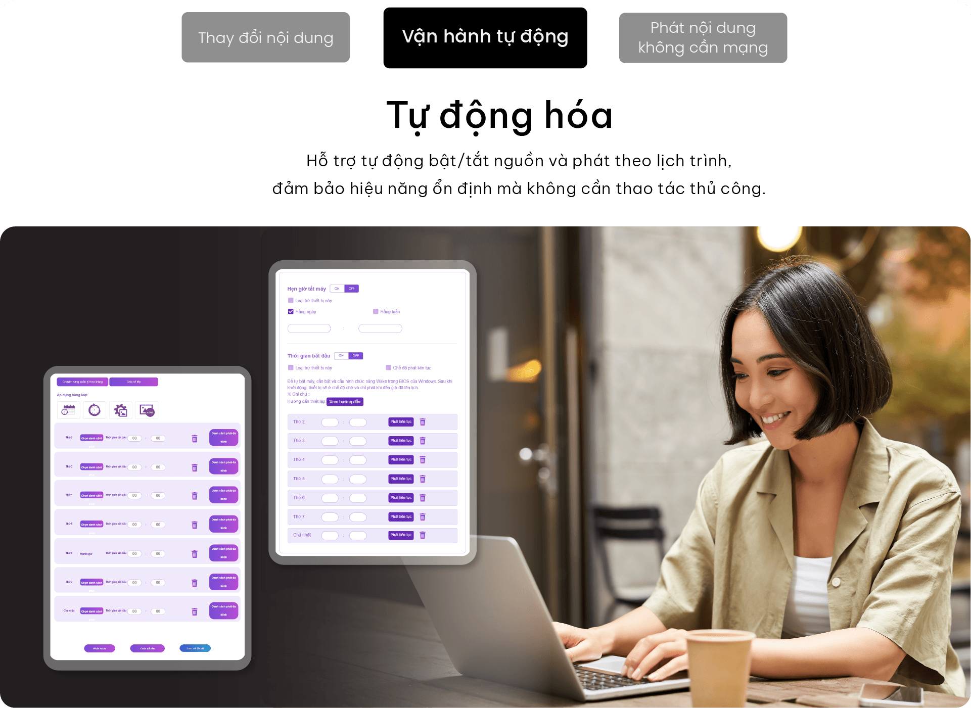 Người dùng chỉ cần cài đặt một lần, màn hình sẽ tự động khởi động và tắt theo lịch trình, giúp tối ưu thời gian và không cần thao tác thủ công.